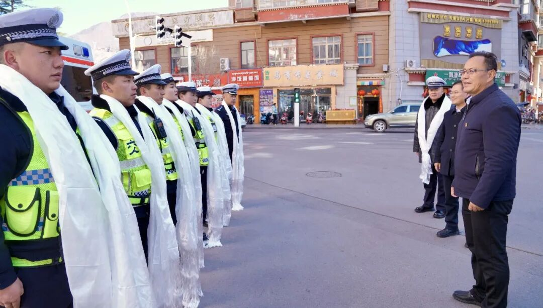在市维稳指挥部、市公安局情报指挥中心,罗庆伍为值班人员献上哈达,致以新春祝福。通过视频指挥系统详细了解道路交通、值班备勤等情况,叮嘱大家持续优化指挥调度机制,强化备勤力量,确保应急响应快速、处置高效。