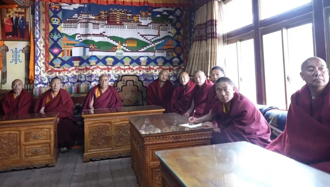 强巴林寺会议室内,庄重而肃静。民管会成员及僧人代表齐聚一堂,当报告中提及民族团结和宗教和顺的内容时,大家频频点头,认真记录。